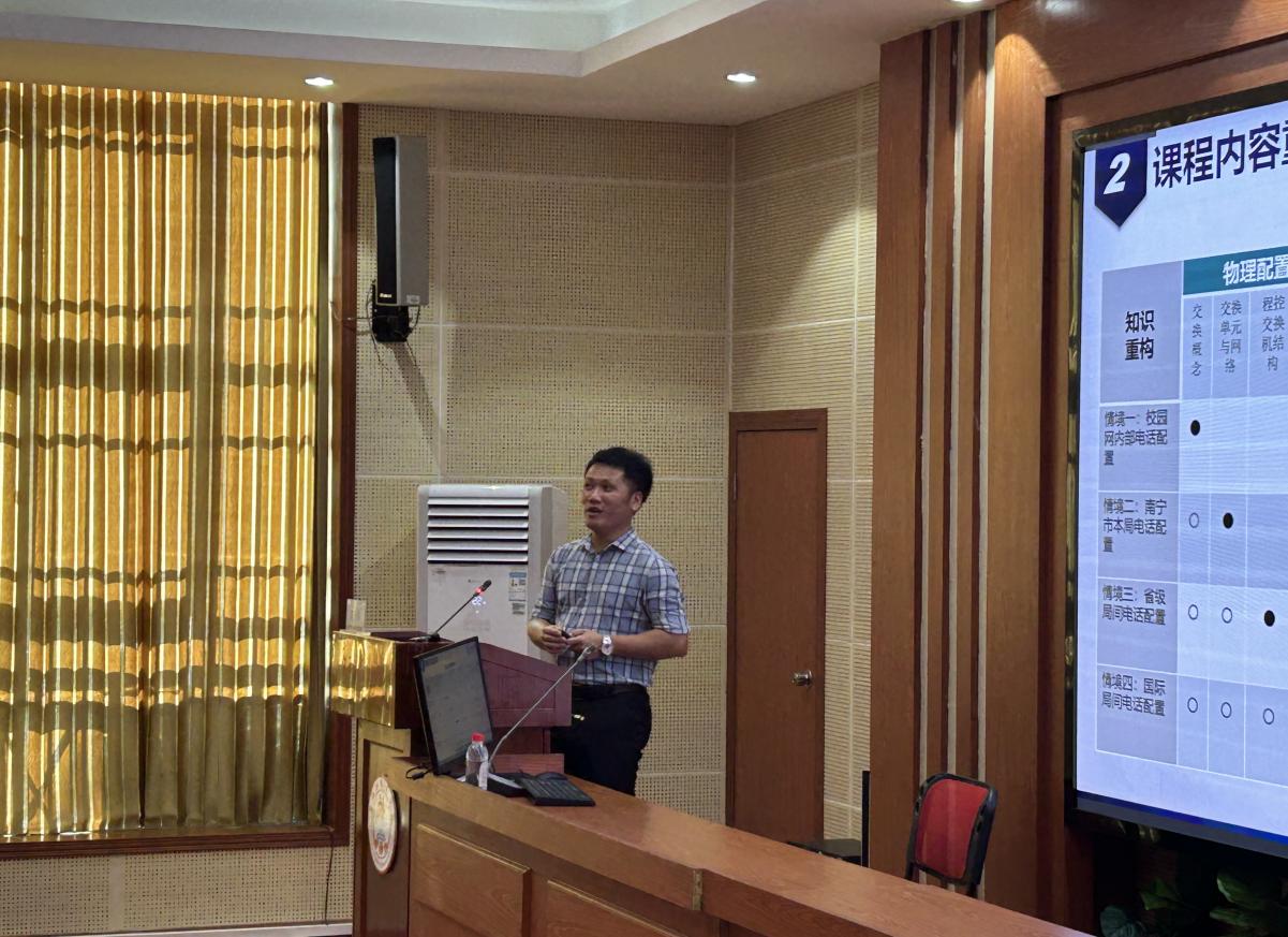 谈及课程内容重构,陈教授以自治区一流本科课程《现代交换技术》为例,生动展现了 “从知识体系到行动体系” 的转型路径。“过去我们按‘交换概念 - 交换单元 - 通信协议’的学科逻辑授课,学生学完却不知如何解决实际问题。” 他通过对比传统课程与重构后课程的差异,详解 “三重构三设计” 理念:依据应用 “类型” 重构课程逻辑、依据应用 “能力” 重构课程目标、依据应用 “变化” 重构课程内容,依托 “跨界” 设计实施载体、基于 “真实” 设计实施流程、“因类” 设计教学方法。在《现代交换技术》课程中,团队将 20 个知识点拆解融入 “校园网内部电话配置”“国际局间电话配置” 等 4 个真实项目,通过 “项目从小到大、技能由易到难” 的梯度设计,让学生在完成任务的过程中掌握技术要点,同时融入 “科技强国”“职业道德” 等课程思政元素,实现 “知技情” 三维培养。